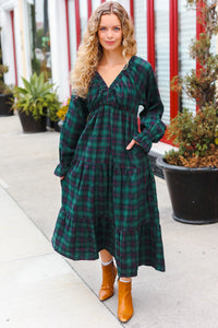 All I Want Hunter Green Plaid Elastic V Neck Tiered Maxi Dress